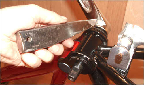 El brazo de biela puede ser otra parte difíciles para quitar, especialmente de algunos a la corrosión se ha formado entre el eje y el brazo de la biela. Utilice un perno largo, o algún tipo de cuña de acero para bang el brazo de manivela como se muestra en la figura 13. La cuña debe colocarse siempre en el brazo de la biela y no el plato o el plato fino se doblará. Otra vez, un poco de calor mediante el soplete puede hacer un brazo de biela realmente atascado se movió.