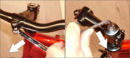 El manillar se llevan a cabo en lugar por la pinza en el extremo del cuello de cisne y es retirable aflojando la tuerca como se muestra en la mitad superior de la figura 15. Usted necesitará la empuñadura y palancas extraídas al menos un lado del manillar por lo que puede resbalar en la abrazadera antes de quitarlas completamente. El cuello de cisne real se lleva a cabo en el vástago de la horquilla por una cuña en forma de tuerca que se lanza girando el tornillo en el centro del cuello de cisne como se muestra en la mitad inferior de la figura 15.