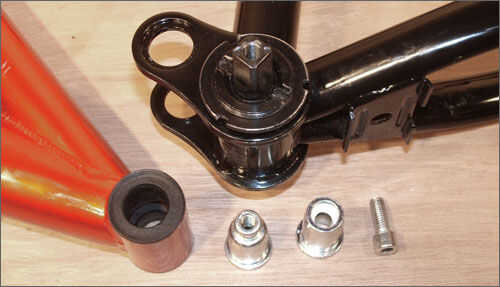 Figura 26 muestra las partes de pivote de la suspensión trasera una vez que se retiran. El pequeño tubo que se suelda con autógena a la estructura tiene un par de tapones de plástico que actúa como superficie de rodamiento para el perno del pivote, así que no olvides a golpecito hacia fuera si usted planea en la soldadura o corte de este tubo. Algunos marcos de suspensión de calidad superiores pueden incidir realmente en lugar de los tapones de plástico.