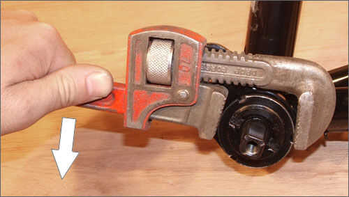 Para quitar el hardware de soporte inferior, empezar aflojando el anillo de fijación en el lado izquierdo del marco girando contra las agujas del reloj como se muestra en la figura 27. Este anillo bloquea el pedalier teniendo la taza en su lugar y debe ser fácil de quitar golpeando en la ranura con un martillo y un cincel o con una llave de pipa a agarrarlo.