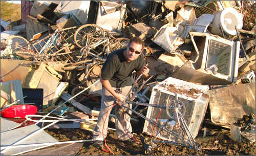 Dile a todos tus amigos y familiares que usted tomar todos chatarra, especialmente piezas de la bicicleta, y sin darte cuenta, tu garaje tendrá un maravilloso montón de basura para trabajar con. Tengo la suerte suficiente para tener un trozo de metal de la pila en el vertedero municipal, donde puedo encontrar fácilmente 10 o más bicicletas todos los días visite, pero incluso si usted tiene que cavar alrededor de la basura, no toma mucho tiempo para acumular una enorme colección de piezas. La Figura 29 muestra un día típico en mi tienda favorita de hardware – la ciudad descarga chatarra pila.