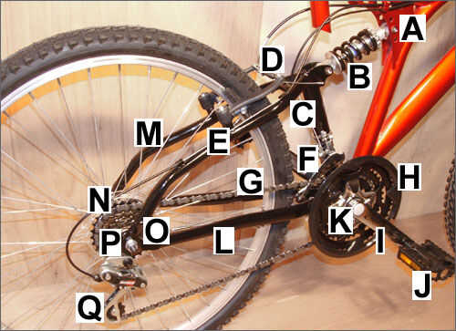 C) triángulo posterior. Toda la parte móvil de la suspensión trasera se llama el triángulo trasero. En cualquier marco de la bicicleta, este conjunto incluye el tubo del asiento, asiento (M), y la cadena (L). Las tres partes realmente forman un triángulo diseñado para llevar la rueda trasera. Esta Asamblea es extremadamente fuerte.