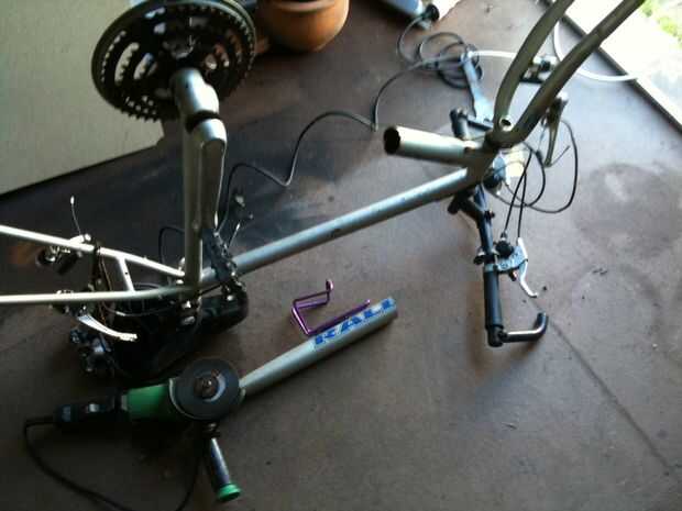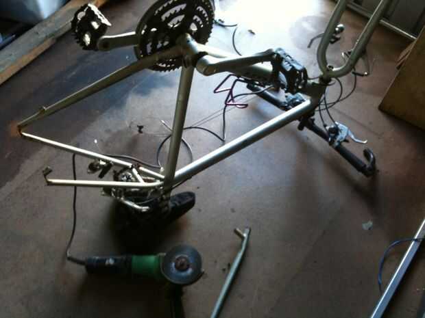 Ahora empecé a cortar el soporte inferior con el tubo del asiento todavía Unido. Usar una amoladora de 125mm con un disco de corte de 1mm. Corta como un cuchillo caliente a través de la mantequilla. Luego corté el cuello en dirección hacia fuera, mientras se quitan los frenos y cables y cosas como ejecutar en ellos.