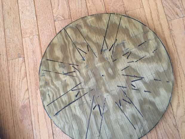 poner las estacas en el centro y dibujar a lo largo de los bordes que debe ser 7 en cada rueda