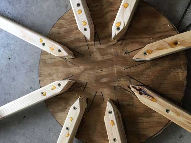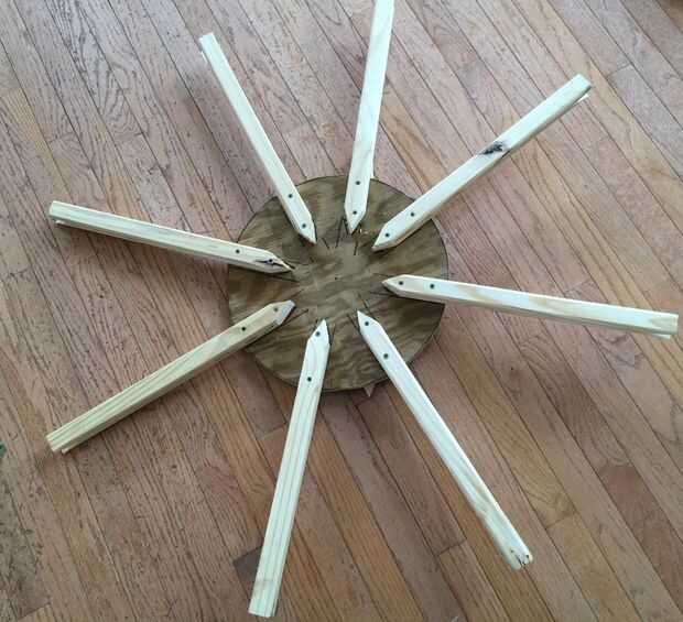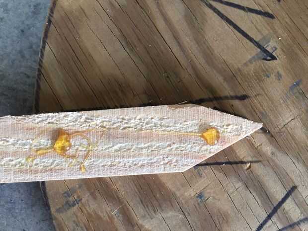 poner una dos pequeñas gotas de pegamento para madera en cualquier parte entre las líneas en el círculo y poner la estaca en él