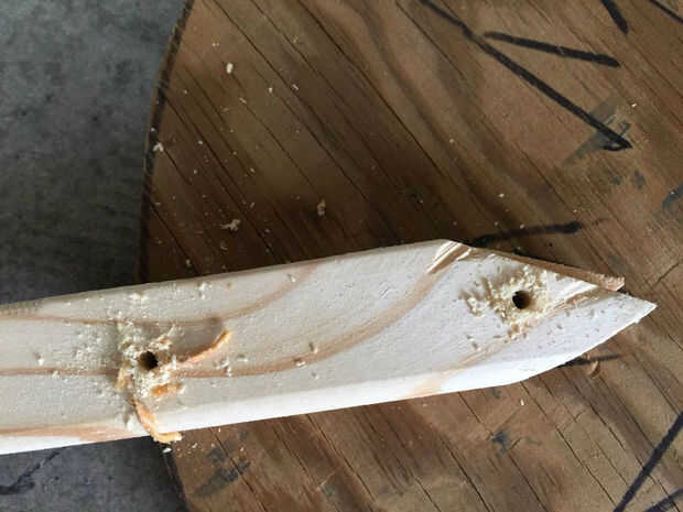 Luego ponga dos gotas de pegamento en la parte superior de la estaca y puso la otra estaca y taladrar dos orificios piloto en aproximadamente el mismo lugar