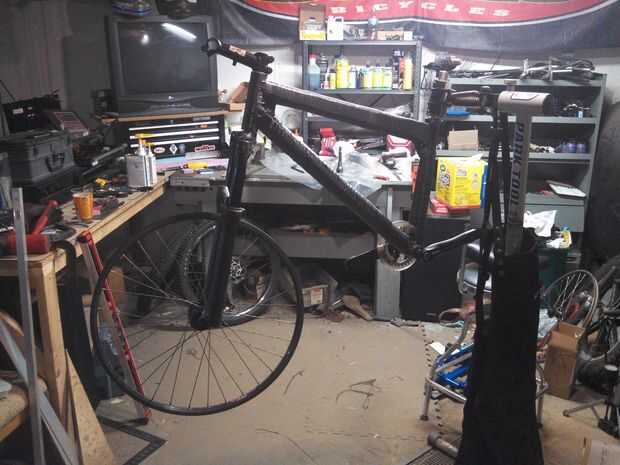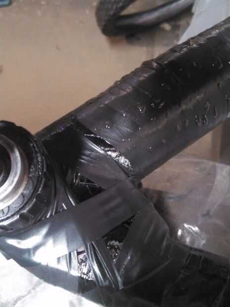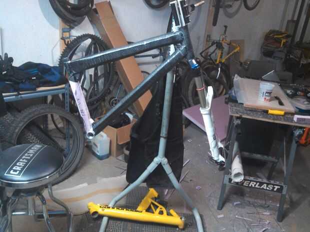 Ahora en los "tubos". Es hora de empezar a jugar con la espuma. Puede hacer los tubos en cualquier forma que desee con la espuma, pero el más simple de la forma más fácil será conseguir buena compresión sobre el carbón capas con cinta aislante. Hice tubos en algún lugar entre círculos y octógonos, y fueron ovalados en los extremos para permitir más área de contacto en uniones de tubo. He añadido trocitos entre los tubos en los cruces para refuerzos. Asegúrese de que antes de empezar a poner carbón para comprobar autorizaciones para su transmisión (incluyendo línea de la cadena en los extremos), ruedas/neumáticos y freno rotor.