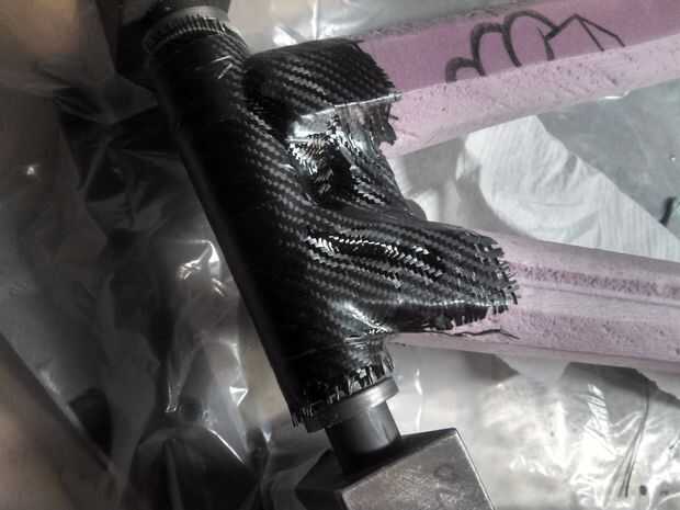Rascado las cáscaras headtube y parte inferior de soporte para promover adherencia. Envuelve las piezas de aluminio en fibra de vidrio para eliminar la corrosión galvánica entre el aluminio y la fibra de carbono que pasaría si estuvieran en contacto directo. Esta corrosión llevaría al debilitamiento de las articulaciones y posible fracaso.