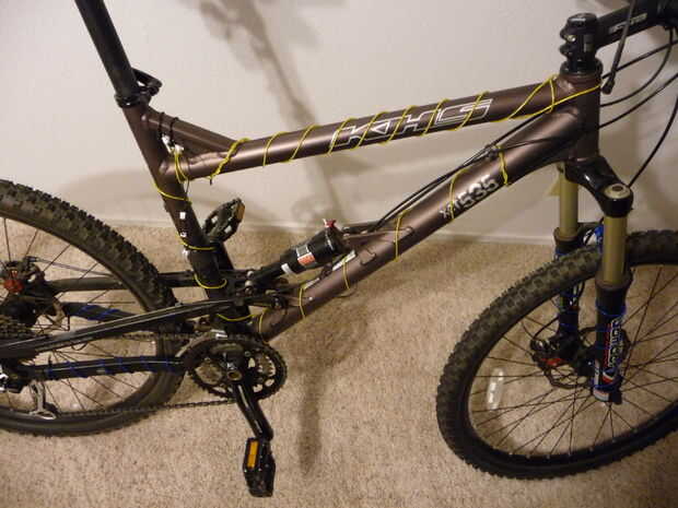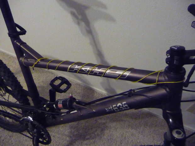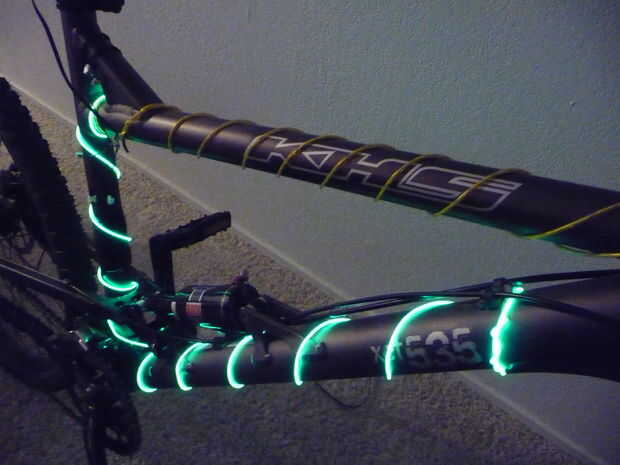 Hay dos tiras de EL hilo que estoy usando para el marco del centro. Una sola tira para el tubo superior y una segunda franja que se extiende hacia abajo del tubo del asiento y el tubo de abajo. Comencé a ambas bandas en el cruce de 90 grados donde el tubo del asiento y el tubo superior satisfacer, ya que tengo un pequeño triángulo hay que puedo alimentar mi cableado, junto con ella estar cerca de la ubicación final de inversores en el centro del tubo del asiento.