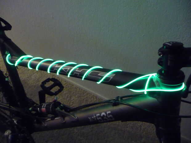 Asegúrese de enhebrar el alambre para el tubo de la parte superior bajo el cable de la cambio de engranaje y alrededor de la muñeca como un punto de montaje sólido. Una vez que están envuelto, enchúfelos en el inversor, conecte el inversor a la batería y luz para arriba.