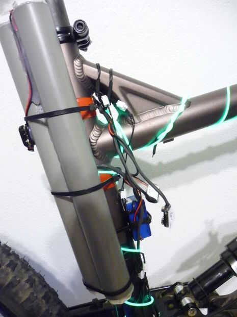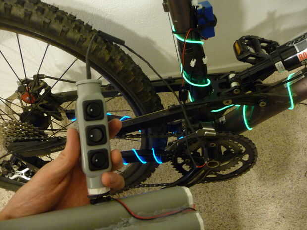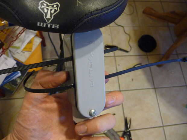 Tengo la clavija 9v de mi caja de conmutadores mirando detrás de mí, y los cables de componente emergente en el poste de asiento, para envolverlo alrededor del asiento del tubo en el triángulo donde se potencia todo. Coloqué dos abrazaderas de plástico debajo de la placa de la caja del interruptor (pero atrapado por los tornillos), apretar los tornillos, poner los lazos zip alrededor de las barras de metal de mi asiento y los apretados hasta la celebración de sólido.