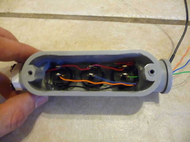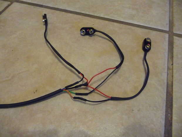 La caja del interruptor ya tiene el cable rojo que suministran electricidad positiva a cada interruptor. Todos los componentes utilizan el mismo negativo (cable negro) que va a 9v Snap-On conector en el enchufe blanco. Corte un cable de ethernet para recibir tres cables de colores diferentes, naranja, azul y verde, para ayudar a facilitar el cableado. Se soldar los cables naranja, azul y verdes a la segunda terminal de cada interruptor respectivo. En el fondo tengo una imagen que muestra cómo la polaridad se invierte con cada conexión entre los conectores de 9v, algo a tener en cuenta al planificar su cableado.
