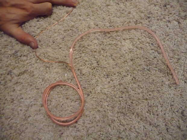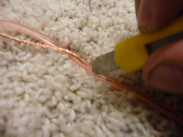 Tomó un pie de 1 1/2 pieza 16 AWG de cable de altavoz para hacer cada amortiguador de alambre. No tiene que ser ese espesor específico de alambre, pero necesitamos una gota bastante gruesa de metal blando (1/2" alto, 1" de ancho) para actuar como un amortiguador de dirección. Uso una hoja de afeitar de cuchilla X-acto para cortar la longitud del cable y extraiga el cable del altavoz, que es mucho más fácil y más rápido que cómo los cables normalmente se pelan cortando alrededor de la envoltura y deslizar. Otra buena fuente de materia prima metálica es cables de computadora vieja con un montón de alfileres en ellos, como el metal de protección en los cables SCSI, estoy seguro de que encontrará algo. Tengo fotos que ilustran cómo lo hice.