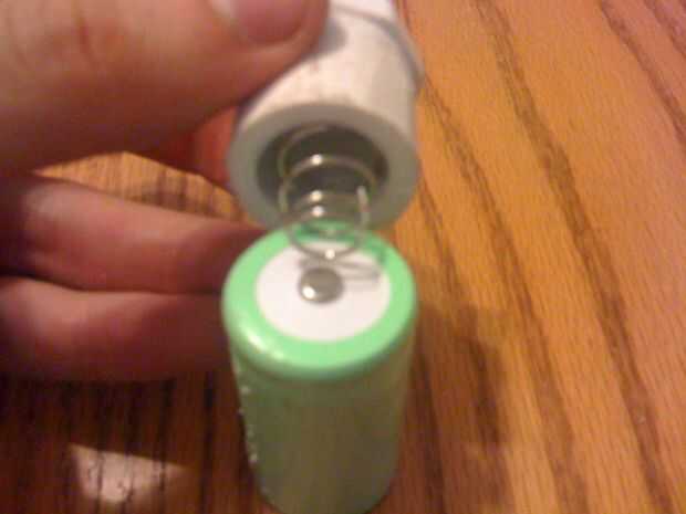 Se insertará un enchufe en cada extremo, que contiene un resorte que se introduzca las baterías en ambos extremos y terminales sobresalen de la parte posterior de cada enchufe. Mechones de alambre de cobre va entre cada primavera y la terminal de la batería, ya que consigue machacado y doblar con la repetición de impacto (caballo). Los dos tubos será caliente-pegados juntos para la fuerza y espacio mínimo y conectado en serie con un cortocircuito, alambre de 1". El completo 12v se accederá por soldar un conector de 9v Snap-On a los terminales que sobresalgan los tubos opuestos. Pegamento caliente todo lo celebrará, junto con el sellado de los tubos para ser impermeable. Tanta tensión como sea posible de las baterías se prefiere, desde bicicletas de montaña toman mucha fuerza de choque que puede hacer que las baterías para rebotar y luces a parpadear molesto en la corta brecha de electricidad.