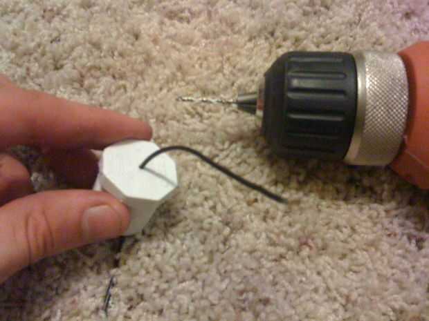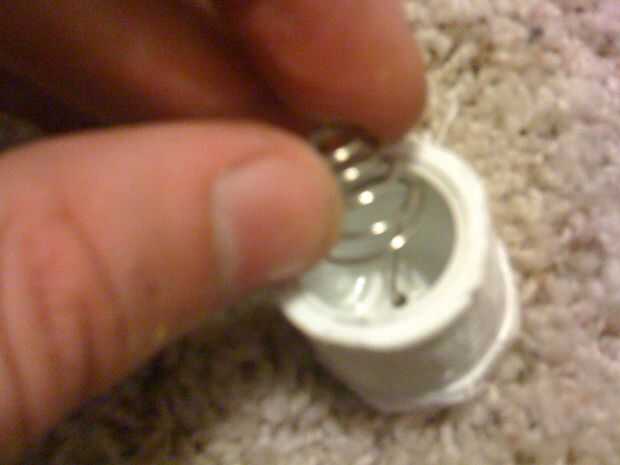 Con sus alicates estirar el extremo posterior de la primavera a través del agujero en el tapón. Con aproximadamente 1/8" que sobresale, agarrar y torcer con los alicates de punta de aguja para evitar que se caiga, además de hacer un terminal para soldar a.
