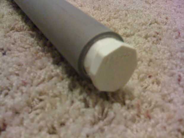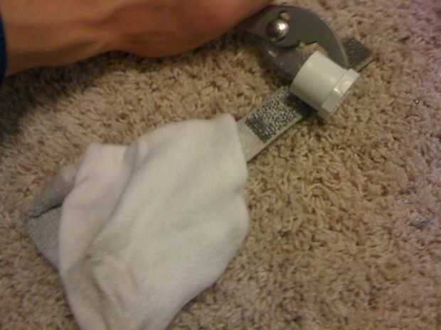 Los tapones de PVC 3/4" no caben en el 1" tubería de Conduit eléctrico PVC. Son aproximadamente 1/16" de demasiado amplia, que es esencialmente nada. Debido a este pequeño tamaño, usaremos un archivo para moler todo el lado del enchufe hasta que encaja. Me tomó cerca de 90 segundos de presentación por enchufe para que se ajuste. Un vicio sería preferible mantener el enchufe, no tiene uno, así que usé un par de pinzas. Sugiero mantener el archivo con un paño.
