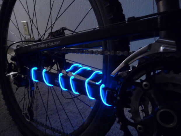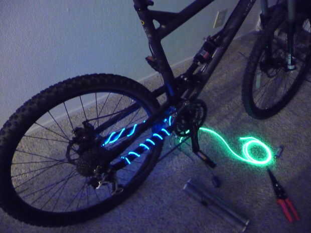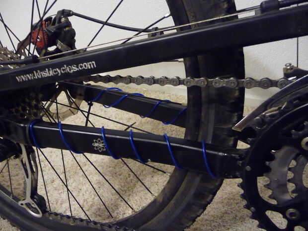 Mi bicicleta tiene estancias de cadena bajo, compuestos, ya que el diseño de la suspensión es más bien poco ortodoxo. Esto permite que el marco sea muy bajo y mi suspensión muy reactivo (es decir, constantemente se transmite la energía sin rebotar). Mi cadena de estancias son muy estrechas en comparación con la forma de estándar "triángulo completo", pero como resultado de mis barras superiores e inferiores pivote mucho. Salto de alambre entre ambas podría ser una muy mala idea, ya que un salto duro les podría encajar en la brecha. Por esta razón, sólo puse mi EL alambre en la estancia de cadena inferior. La bicicleta, sin duda, se diseñarán diferentemente, así que uso lo que adapte a su diseño de la suspensión.