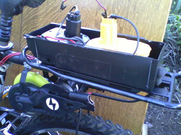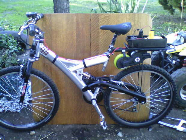 recientemente vi esta bicicleta de montaña con una señal libre en él, así que arrebató arriba y tomó el hogar y con un mínimo esfuerzo consiguió funcionando como nuevo otra vez. Entonces recordé tenía un motor de scooter de razor y decidí ver si podría la bicicleta utilizando sólo la rueda fabricantes de alimentación y aplicar la fricción al neumático. Así que la vespa era todo intacta excepto el conjunto de manillar. Dejando la estructura metálica que ocupa el compartimiento plástico de la batería y los soportes para el motor y la rueda. Y los soportes para el motor y la rueda tenían dos canales de metal que corría aprox. 1" sobre el motor y la corriente de la rueda, derecha a izquierda o vise viceversa si estás buscando hacia abajo el motor desde arriba. Así que tomé y corte los 2 canales a la mitad en el centro. Yo entonces había doblado ya sea hacia arriba, dejando una separación de 1.25" entre cada brazo de soporte opuestos. (es un buen medidor de metal por lo que es muy fuerte) Ahora que tenía un total de cuatro brazos de soporte se pegue hacia arriba aprox. 2.5" luego perforé un orificio de 1/4' en cada brazo de soporte. La rejilla en la moto que este motor está conectado tiene un 1.25" tubo de metal que corre a lo largo de la cremallera en la parte inferior hacia la llanta. Luego perforé dos agujeros tubo alineando con los cuatro agujeros que perforaron en los brazos de soporte doblada hacia arriba y había espacio un 1.25" aparte. Tomé algunos todos rosca y arandelas y tuercas y había montado en el montaje del motor al bastidor. Ahora, después de terminar el proyecto y yo sabía que esto iba a ser un problema, y que es que la bici tiene suspensión, un choque. Por lo que puedo puedo configurarlo para que cuando monto en bici (190 libras) sé cuánto se oprimirá el choque cuando im sentado en la moto y dicta también la presión está siendo aplicada por la rueda de la vespa para el neumático de la bici. Pero si alguien llega a que es de 140 libras, bien entonces tengo que ajustar la altura de la parrilla y así sucesivamente. Si lo hice todo otra vez id elegir una bicicleta con sin suspensión trasera, marco fijada de a. Pero si te fijas en la foto #2 se puede ver mejor donde cortar que soporte canal n lo doblado hacia arriba, tal vez usted obtendrá una mejor idea de por qué lo hice y cómo une todo con la tubería debajo de la parrilla. Tomé el compartimento de las pilas fuera de la vespa y adjunta a la parte superior de la rejilla con dos elásticos muy pequeños como cables. Usé el arnés del cableado original de la moto para hacer la conexión a las baterías y el interruptor. Ahora las baterías Dewalt 18v conecté en una serie, lo que significa que salté el terminal negativo de la batería 1 a la terminal positiva de batería 2, luego conectan la alimentación del positivo al motor al borne positivo de batería 1 y el negativo de alimentación a la terminal de batería dos, NEG darme 36v del poder en lugar de 18 (y va a tomar a 54v en un futuro próximo) y hace el truco que primero probé sólo 18v y woulod tienen que pedalear hasta spedd entonces en un plano superficial la moto sería mantener una velocidad constante de aproximadamente 4-5 mph y ayudó a poco subiendo colinas. Con 2 baterías. un plano de superficie puedo golpear el interruptor y de un paro la moto acelerará hasta aprox. 10-12 mph. Pero subiendo colinas ahora es impresionante, en un engranaje de Id nunca utilizar para subir a una colina en, yo puedo ahora fácilmente lo componen esta super empinada por mi casa con el mínimo esfuerzo. Quiero decir que tengo a pedal, pero su esfuerzo... Y no tenía ningunos interruptores poniendo todo excepto un viejo techo ventilador cadena interruptor, sí lo has adivinado, tire de la cadena 1, nada, 2 veces nada, tiempo 3 veces y su sobre, jajaja no broma que tiene como su potencia en. IM también va a jugar con adherir un material mejor para la rueda de la vespa en vez de eso plástico duro suave. Tracción mejor del pensamiento de IM, significa menos fricción es necesaria para poder el significado de la bicicleta una mayor velocidad, quien sabe. Soy sólo un tonto fontanero con muchos gadgets en su granero para jugar n construir cosas de. Identificación como escuchar a los otros compañeros aquí que hizo la misma cosa sólo es en la rueda delantera...