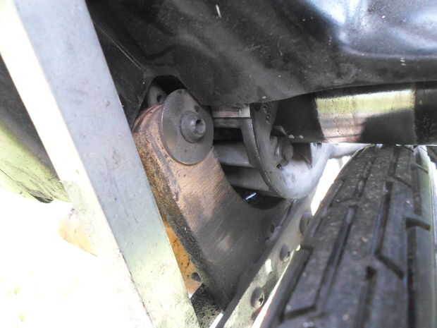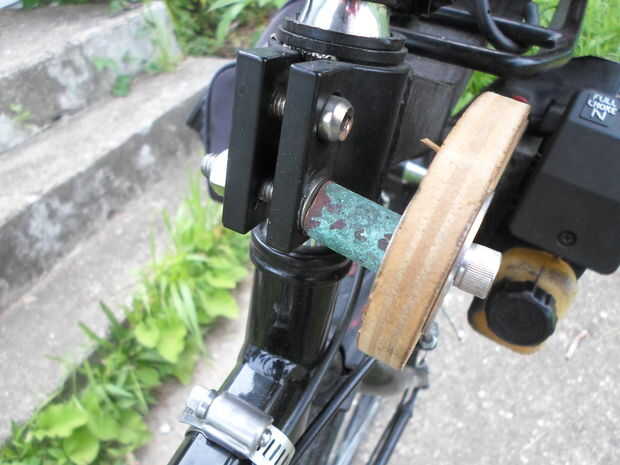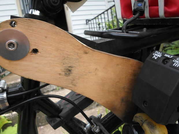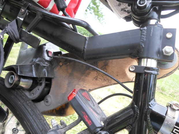 No antes de montar el motor, corté las partes de la carcasa de plástico que quise. Luego, conecté una varilla de eje de bicicleta al cigüeñal. El mejor método de hacer esto dependerá del tipo de motor. En mi caso, enrosqué el extremo del cigüeñal con mi juego de herramientas de roscar. Luego, inserté el cigüeñal en la varilla, usando una tuerca normal y una contratuerca de nailon para mantener todo en su lugar. Una vez decidas cómo vas a conectar la varilla, tienes averiguar un método de conectarlo a la bici. De usar una hoja de cartón como plantilla, corté un brazo giratorio de contrachapada de 1/2". Incluido el patrón del diseño. Luego, conecté el motor al brazo, y el brazo a la rejilla de la bici. Usé un perno y un espaciador, hecho de un tubo de cobre, para alinear el brazo con la rueda. El brazo giratorio me permitirá conectar/desconectar el motor de la rueda mediante una palanca en el manillar. En el paso siguiente, instalamos el sistema de apoyo trasero.