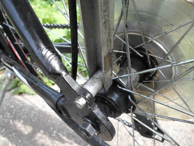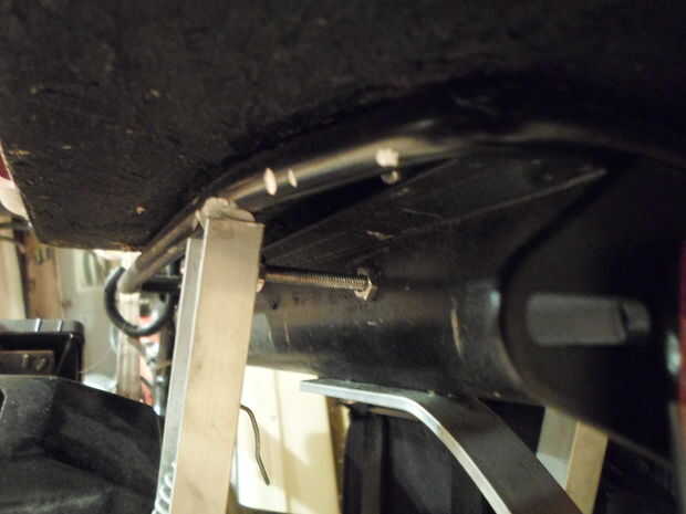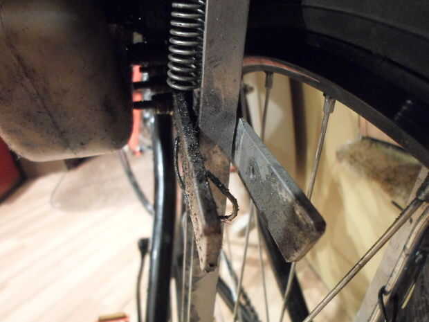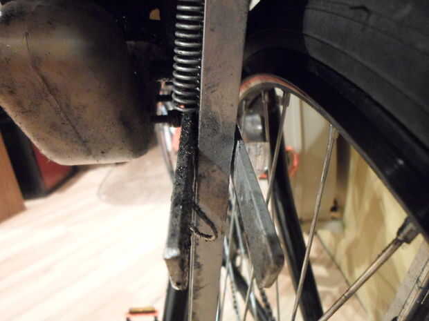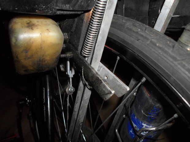 El punto de montaje frontal no es suficiente para mantener el motor alineado con la rueda por sí mismo. Empecé por cortar dos trozos de aluminio acanalado, uno para cada lado. En la rueda de muchas bicicletas, en el eje trasero, hay una pestaña para Kinnickinnic un guardabarros de las Naciones Unidas. Aproveché este como mi punto de montaje inferior. Para el punto de montaje superior, taladré un agujero a través de la rejilla, usando un perno largo y un espaciador para mantenerlo en su lugar. Los espaciadores Chávez para mantener especiales los trozos de aluminio. Esto mantendrá el brazo giratorio en su lugar, alineado con la rueda, y la varilla en un ángulo de 90 º al neumático. Hice lo mismo en el otro lado, con el fin de ejecuta la rejilla. A continuación, hice un soporte, con el trozo de la barra plana de 1/8 "x 1", para mantener alineado el brazo giratorio. Corté dos trozos una medida, fijando cada uno al brazo giratorio de manera apretaban el aluminio acanalado. Tienen estar lo bastante apretados alrededor de este para mantener el brazo giratorio alineado, pero no demasiado para todavía el brazo se pueda mover hacia arriba y abajo. El siguiente paso es instalar el muelle levantará el motor cuando paras. Para hacer esto, solo tienes taladrar un agujero en el aluminio acanalado, enganchando un extremo del muelle en el agujero; Luego, taladra otro agujero en la barra guía (la aprieta el aluminio acanalado) y engancha el otro extremo del muelle en ello. En el siguiente paso, instalamos la palanca y el cable levantarán el motor y la palanca y el cable para el serie.