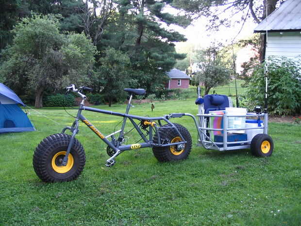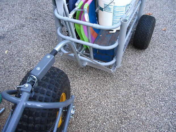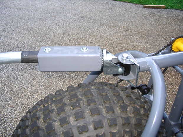 Articulación del montaje se hace de una 2 "x 2" tubo de acero soldado a una rueda giratoria. Caster es cortar cuadrado para encajar en el enganche de la bicicleta.