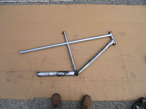 Usé el marco de la bici principal donante junto a piezas (óvalo) de una bicicleta bmx para formar la parte inferior horizontal tubo y 1 1/2" galvanizado eléctrico conducto rígido para el tubo superior extendido nueva. Que terminó cortando el tubo del asiento e insertar a través de un agujero en el conducto luego de la soldadura del tubo del asiento de nuevo juntos. Yo soldado junto con una cinta externa para no reducir el interior dimensión necesaria para el tubo del sillín.
