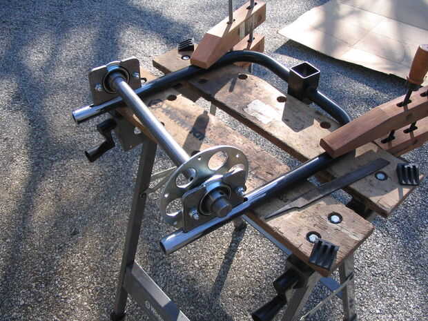 El basculante fue ranurado para aceptar los soportes de cojinete (chapas) que se sueldan con autógena en lugar. también podían tener abejas apenas soldadas al tubo, pero este basculante tenía tal tubería gruesa y mis conocimientos de soldadura fueron tan mal, pensé que esto era más seguro para este proyecto. Mi diseño de la estructura y geometría (en el cartón) se basó en el método asignación de fechas, si no hubiera tenido que cambiar algo en alguna parte cerca de 3/4".