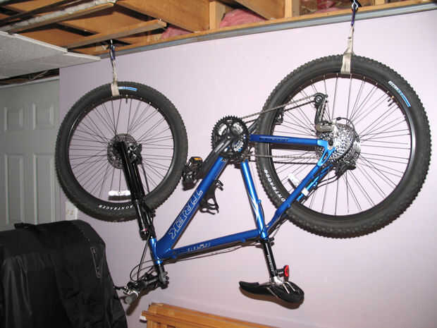 -Levante la bicicleta por la cinta y el clip los mosquetones en las armellas. No hay que subestimar el peso y la dificultad de su bicicleta cuando usted Levante - lo pone más fácil.