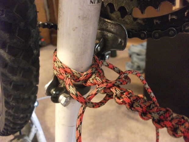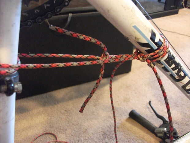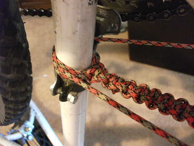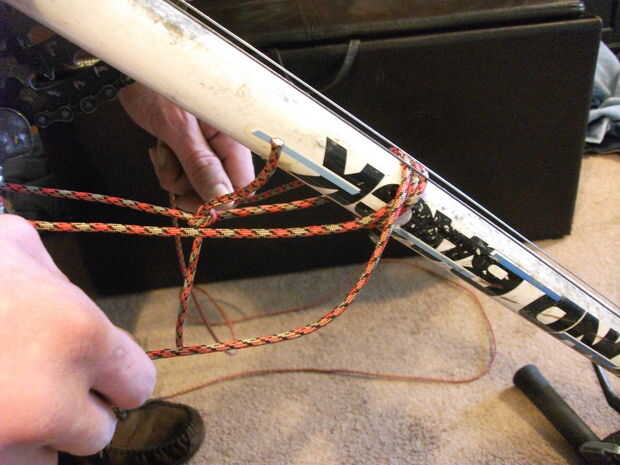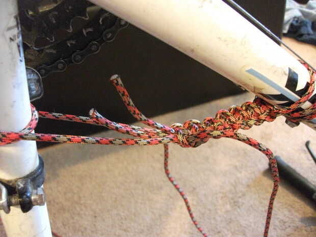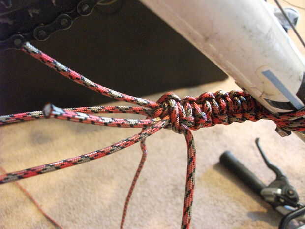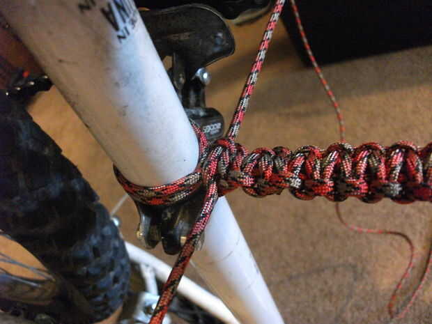 Encontrar el centro del segmento de 15 pies y coloque en la barra para empezar a aplicar la cobra. Aplicar el tejido cobra hasta la siguiente barra y cubriendo el nudo en el proceso. En la segunda barra, enrolle los dos extremos alrededor y siendo la segunda capa de la armadura. Esto hará que sea un mango más grande para agarrar a.