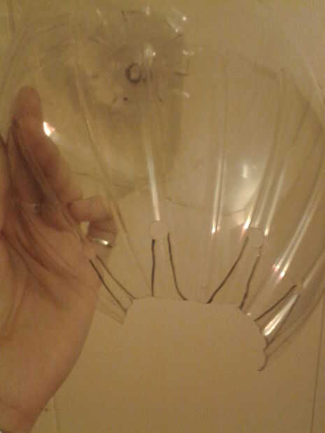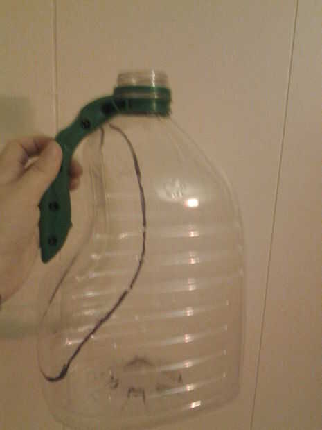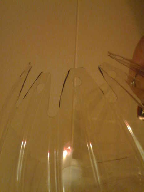 Cuando eso se hace, mirar en la parte superior de la jarra, donde estaba la boca. Es necesario dividirla mentalmente en cuatro o cinco secciones aproximadamente iguales. Utilice los agujeros de golpe a golpe de agujero a través de la plástica entre estas secciones, tan profundamente como se puede llegar. Entonces utilice el marcador permanente para dibujar Vs conectar estos agujeros en la parte superior. Básicamente, lo que está tratando de hacer aquí es hacer a una especie de arreglo de pétalos, que ayudará a la parte superior de la jarra a ser más deformables, para ajustarse a su manillar y cables y hacer tan apretados y garantizar un ajuste como sea posible. La razón que es los agujeros de perforación en primer lugar es para que los cortes terminan en una forma contundente y no mantener "funcionando", arruinando potencialmente la integridad estructural de todo.