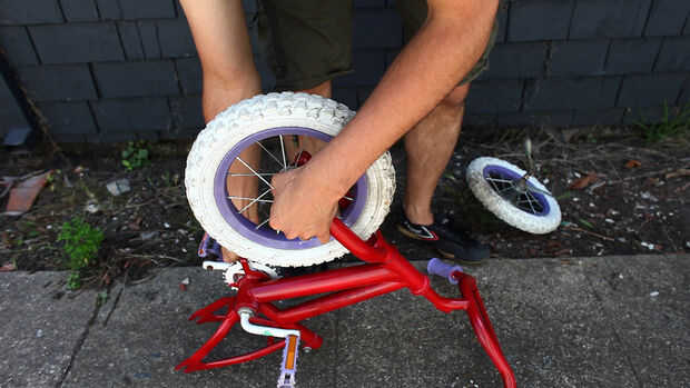 Lo que puede quitar de la bici debe ser sacada. Para esta moto significa quitar las ruedas, las ruedas de entrenamiento, asiento y la cadena de la bicicleta. Las ruedas aquí fueron sacadas con la llave y la herramienta de cadena fue utilizada para deshacer la cadena de la bicicleta.