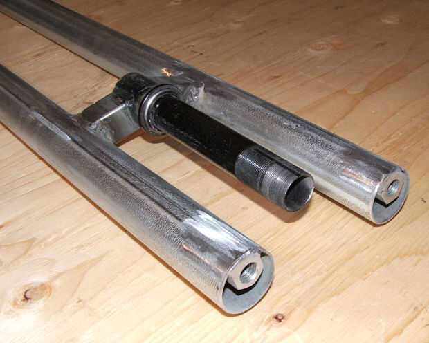 Foto 13 muestra las tuercas de 1/2 pulgada, soldado con autógena en la horquilla. Puesto que el diámetro de los frutos secos es mucho menor que el interior diámetro de la horquilla de la tubería, sólo van soldadas a lo largo de un lado. Este método ofrece un montón de fuerza. Las tuercas deben quedar al ras con la parte superior de la tubería de bifurcación y terminan tanto en el centro como sea posible. Se perforan los agujeros en la placa superior del árbol triple para que coincida con la ubicación de los centros de la tuerca.