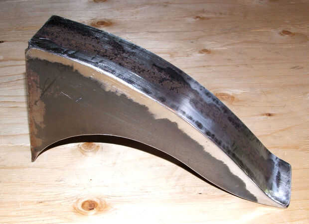 Si tienes algo de paciencia, que el guardabarros acabado tendrán fábrica presionada después aprieta las soldaduras (foto 23). Siempre hago el pulido áspero con un disco pesado, tomando la zona de soldadura casi al ras con el metal, luego cambiar a un disco para el buen trabajo de corte. Una vez hecho el trabajo fino (esto incluye volver a soldar los hoyos y agujeros), utilizo un disco de lijadora para limpiarlo bien.