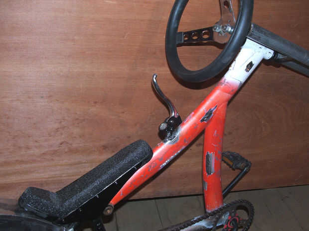 En consonancia con el tema de la fusión de coche-chopper, instalé la palanca del freno como si fuese un cambio de palo. En una motocicleta, este tipo de instalación se llama un "cambio de suicidio", ya que usted tiene que tomar la mano de la dirección que nos. ¿Especie de irónico que esto también es el freno, no crees? Como se muestra en la foto 31, un pequeño trozo de tubo de una barra de la manija se suelda con autógena al marco para que la palanca puede empernar a él.