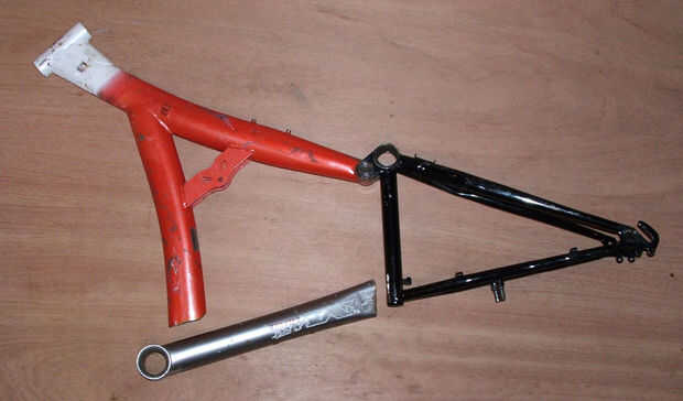 No era nada difícil hacer un marco con estilo de cuadro de bicicleta de montaña - de hecho, toda la trama sólo es necesario un solo corte y soldaduras de dos! Como veis en la foto 3 arriba, el trozo de tubo de asiento poco fue cortado desde el extremo del bastidor y una sección de otra bicicleta de montaña (soporte de fondo y abajo el tubo) se colocó en el lugar eran el resorte de suspensión utilizado que. No sólo crea esto un baja marco estirado, pero coloca el tubo en un ángulo perfecto para algunas horquillas seriamente largos.