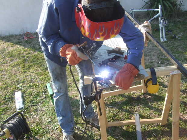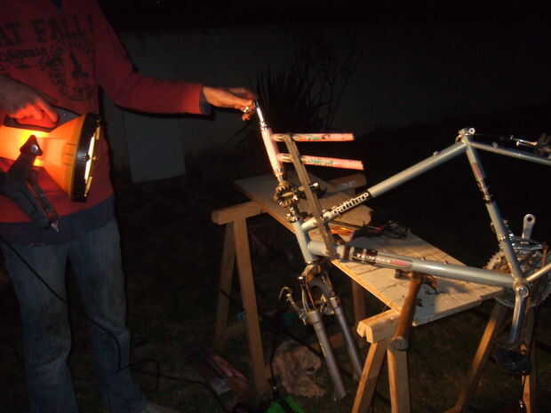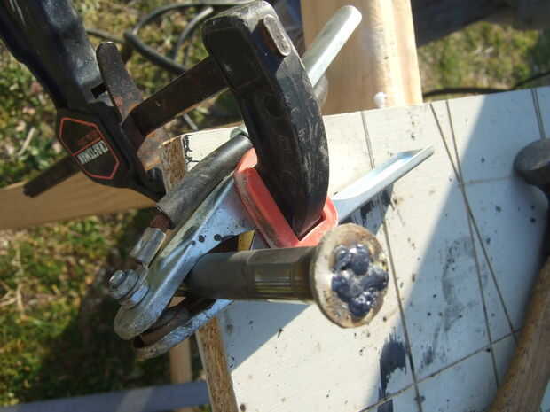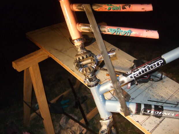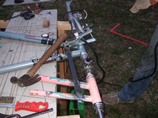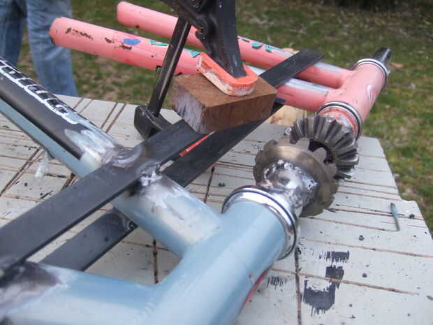 Para añadir en los dos engranajes más pequeños, hemos utilizado la barra del diferencial original, en el extremo de que hemos soldado una arandela para evitar que el equipo salvaje liberando a sí mismo. El árbol fue ampliado con un pequeño tubo y colocado entre las dos barras de metal negro. Así el árbol es parte de la estructura de la bicicleta y no puede moverse, pero los engranajes pueden girar libremente alrededor del árbol. Ver video:
