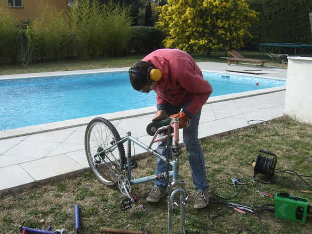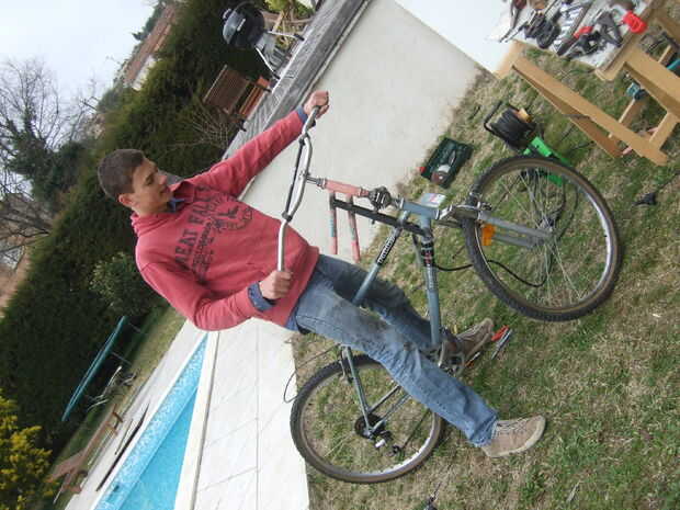 Añadiendo una pieza de tubo, corte de la barra de dirección de la mountainbike y una barra de dirección super cool moto hasta el producto final, ahora a ser terminado. Un poco de pulido y soldadura aquí.