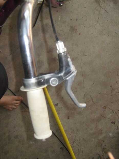 Combinar el freno de mano un el cable y la diapositiva el freno de mano en el manillar de la bicicleta. Esto probablemente será necesario quitar los puños del manillar. Por último, apretar el freno de mano.