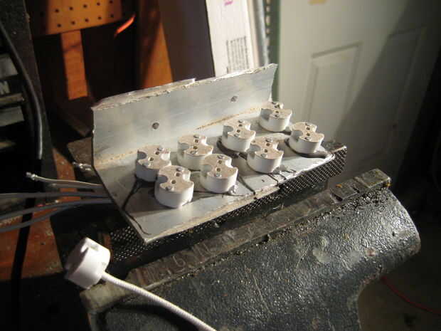 1) separados aproximadamente 4 pulgadas pedazo de chatarra de ángulo a utilizar como una luz placa base 2) taladro 8 ~ 1/8 agujeros para pasar el conector de los cables de la base hacia la parte posterior 3) pasar los cables por los agujeros y los conectores a la placa base de epoxy