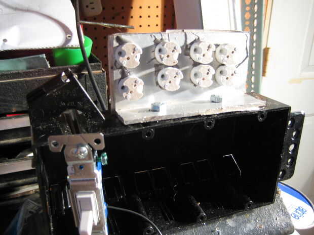 1) perno de la base de luz a una caja de empalme de 4 elementos 2) Conecte los cables (2 bombillas en serie por conmutador) y (cuatro interruptores en paralelo) (ver circuito de imagen en el paso 2)