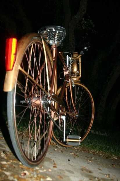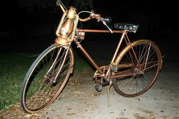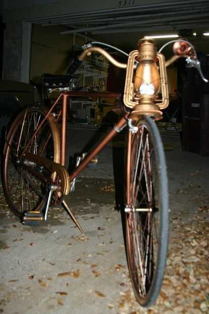 Para la luz delantera, quitó el reflector original pero dejó el montaje base y estilo steampunk clásico azotó la lámpara al frente con un poco de alambre de cobre. Mmmm... huele a metal.