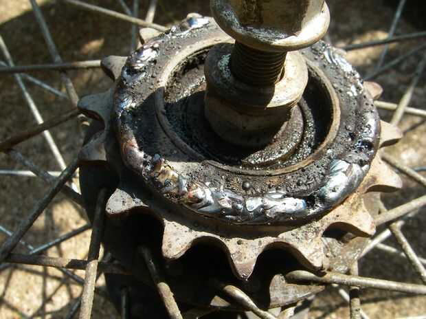 He rociado algún solvente sobre la rueda libre para limpiarlo y simplemente soldar las dos partes en movimiento junto con un soldador de arco (palillo).