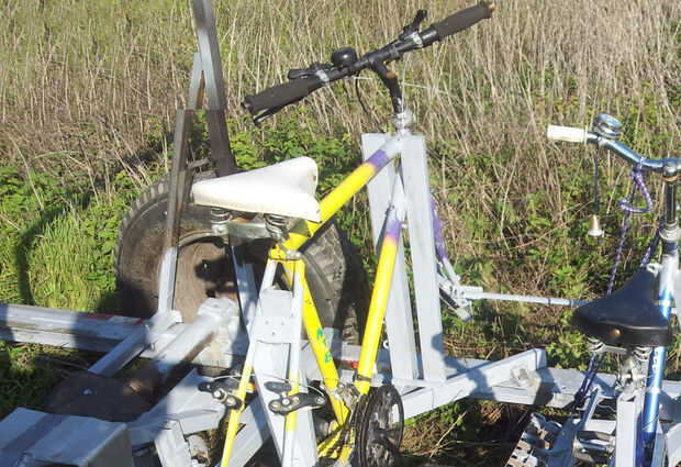 Debería ser fácil hacer una versión más grande con más bicicletas o añadir periféricos como un torno de cable, un generador o similares. Esta cosa aquí aquí fue construido para los niños conducir campo a través.