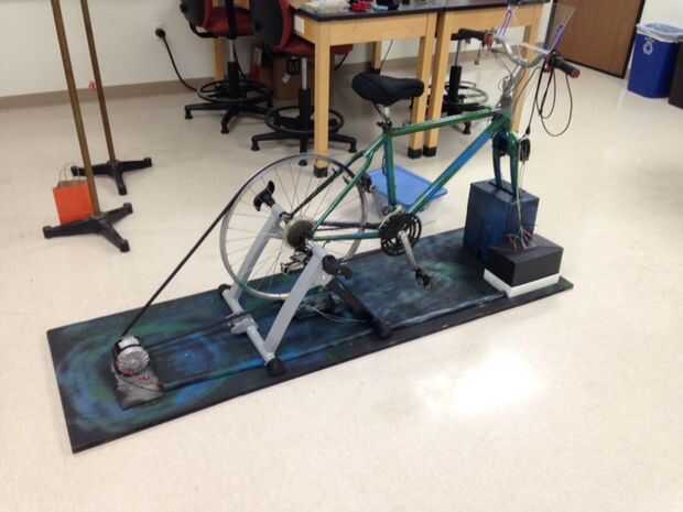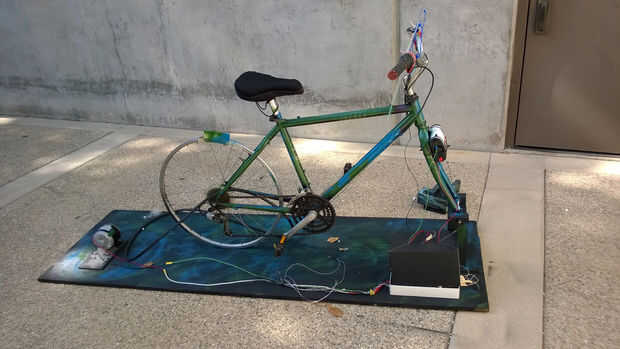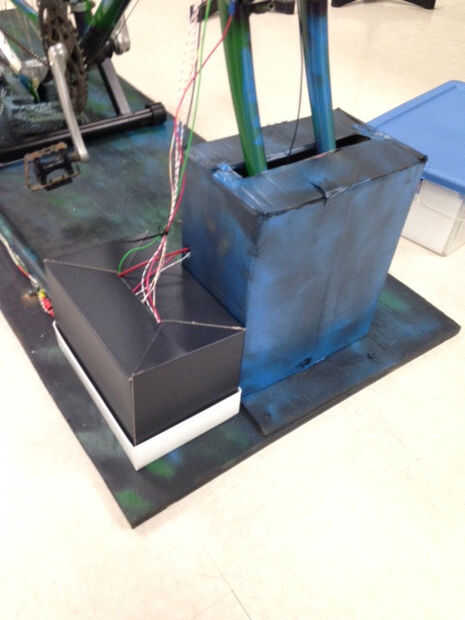Para concluir nuestro proyecto perfectamente había incluido el sobrante en los cables y todo de la electrónica (excepto la pantalla LCD y el inverter) había colocado en un contenedor a la derecha del soporte delantero de la bicicleta. Los agujeros fueron cortados para permitir que los cables ejecutar en la parte trasera de la moto (fotodiodo de LED y el generador), la batería, el inversor y la pantalla LCD. Los cables van a la parte trasera de la moto se cubrieron con la mitad de un tubo de PVC y conectados a la madera contrachapada para mantenerlos fuera del camino. La batería fue alojada en una caja de cartón, sobre todo para mantenerlo fuera de la vista, no que proporcionan alguna protección o seguridad. Un soporte de plástico libro que hemos heredado del anterior equipo fue unido a las barras de la manija en el cual podría colocarse un libro o un teléfono. La pantalla LCD también fue atada a este soporte.