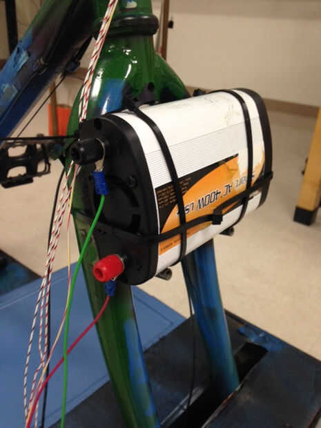 Conectar el inversor a la batería es tan sencillo como conectar el positivo del inversor para el extremo positivo de la batería y el negativo al extremo negativo de la batería. Este es el desnudo mínimo necesario para un generador de bicicleta operacional. El generador cargará la batería mediante el controlador de carga y la fuerza de voluntad de la batería del inversor, carga cualquier dispositivos están conectados.