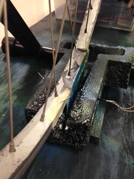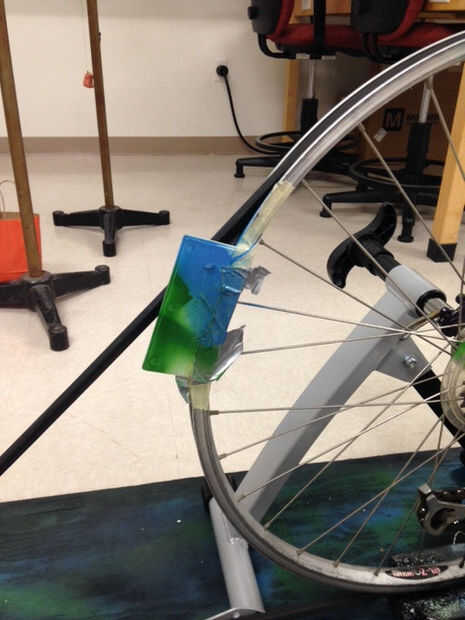 Optamos por construir un sensor óptico de RPM de la moto debido a las piezas que teníamos disponibles. El concepto es simple; Un objeto rígido, opaco (en nuestro caso un rectángulo fino de plástico) se une a la llanta de la rueda trasera para que cada vez que la rueda gira, el objeto intercepta el camino entre un LED y un foto diodo. Para mantener el foto diodo y el LED en su lugar, nos propuso volver a una pieza convenientemente en forma de espuma de poliestireno con una muesca en ella sólo lo suficientemente amplio como para la rueda (ver fotos). Espuma de poliestireno facilita ajustar el LED y el foto diodo directamente alineados entre sí (porque diodos de la foto son muy sensibles a la dirección de la luz, trabajan mejor con la luz directamente en la parte superior, reduciendo así los efectos de la luz ambiente). Si el LED no se alinearon, simple se asomó otro agujero en la espuma de poliestireno en el lugar correcto. También es importante fijar el objeto opaco en el borde para que no interfieran con la correa del ventilador o golpear el marco, terreno, venta de bicicletas u otros obstáculos.