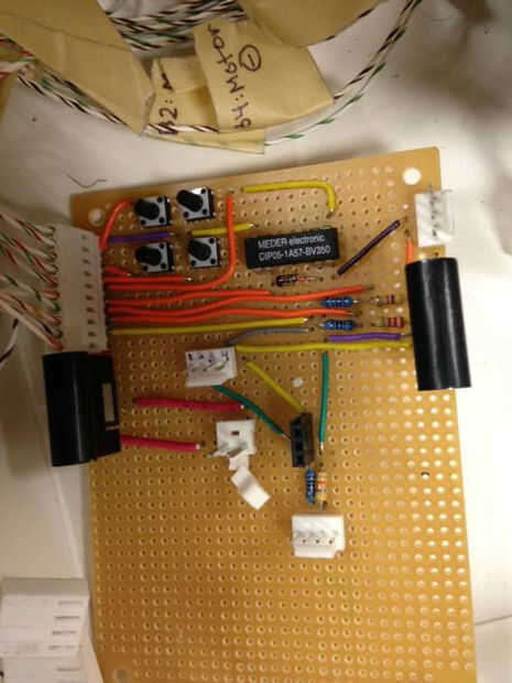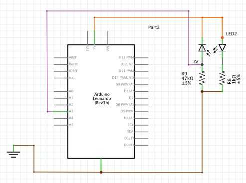 El circuito también es bastante sencillo. Corrimos de 5V de Arduino para el LED y el fotodiodo. Es importante que el LED no es la única cosa entre 5V y masa. El LED no proporciona mucha resistencia y 5V incluso puede enviar una gran cantidad de corriente a través del cable, que puede soplar su LED. Utilizamos un resistor del ohmio 1 k en serie con el LED, lo que significa que la corriente por el LED es sólo ~ 5mA. Lo más importante para recordar cuando se utiliza un fotodiodo que funciona al contrario del LED. En lugar de aplicar un voltaje para producir la luz, una luz se aplica para producir un voltaje, por lo tanto el diodo debe colocarse en el circuito hacia la dirección opuesta como el LED. El voltaje producido por la corriente del diodo de la foto se mide a través de una resistencia en serie después del diodo de la foto. La magnitud de este voltaje es lo de menos porque simplemente queremos saber si el fotodiodo detecta el LED o si está bloqueado. Ajuste de la resistencia siguiente, sin embargo, puede cambiar la magnitud del voltaje medido así que incluso con luz ambiente, el voltaje leído es 0. Hemos encontrado que usando un 47k resistencia ohm hecho para una tensión de 0 cuando está bloqueado y una tensión lo suficientemente significativa para fácilmente medida cuando no estaba bloqueado. Cada vez que el Arduino lee en voltaje de 0, sabe que la rueda ha girado una vez.