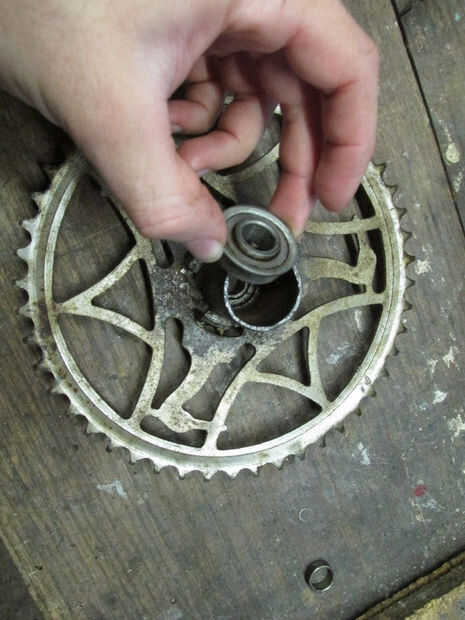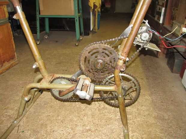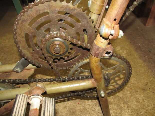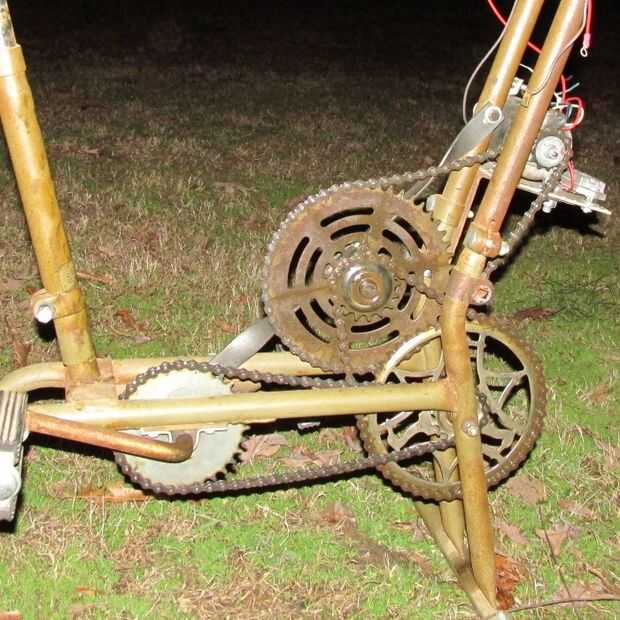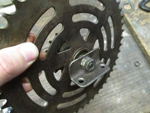 Las partes móviles críticas son los dos juegos de ruedas dentadas; cada juego es un piñón grande conectado a un poco una gira juntos en el mismo eje. Para hacerlas, soldó con autógena los piñones en piezas cortas de tubo de acero. El tubo tiene sólo el derecho de diámetro interior para permitir que los rodamientos en los extremos. Luego se deslice todo el conjunto sobre un eje fijo que se une al marco de la bicicleta de ejercicio. Cuando los conjuntos de montaje, recuerde que montar sus partes móviles sobre placas con ranuras en ellos es un verdadero lujo. Le permite hacer ajustes finos en la tensión de sus cadenas. Muy pequeñas diferencias en la distancia entre dos ruedas dentadas pueden hacer una gran diferencia en la tensión de la cadena que se ejecuta en ellos. La diferencia entre una cadena floja y una cadena que es demasiado apretada para ejecutar puede ser menor de un octavo de pulgada.