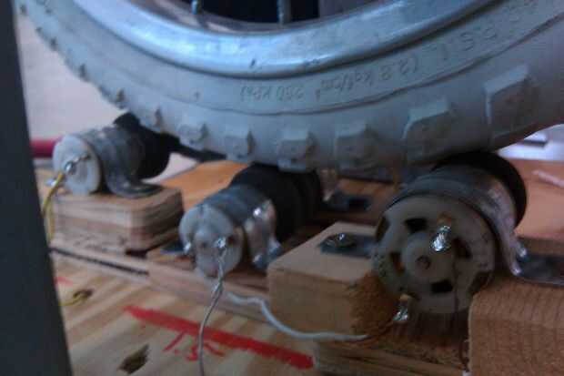 y conecte todos sus motores a una pieza de madera en su stand de moto justo encima de la rueda