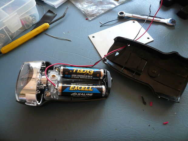 Ahora todo lo que necesita es conectarlo a la luz principal. Solo empuja los extremos de los cables detrás de los terminales de la batería en la luz principal y luego perforó un agujero en la luz para funcionar los alambres a través. Los alambres se conectaron al conector de la batería. Utilicé este porque quería ser capaz de desconectar la luz de la cabeza rápidamente. El cuadro de proyecto necesita ranuras o agujeros para los cables de la luz y el motor.